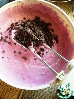 Взбить с молоком по инструкции сухой ванильный крем. Можно заменить на взбитые в крутую пену густые 35% сливки, но я в продаже не нашла. А сухой крем отлично держит форму, легкий и воздушный. В часть крема добавить растворенный желатин. Я предварительно сливаю через мелкое сито свободную жидкость. Смешать с оставшимся кремом. Аккуратно примешать крем к ягодной основе, добавить тертый шоколад, еще раз перемешать.