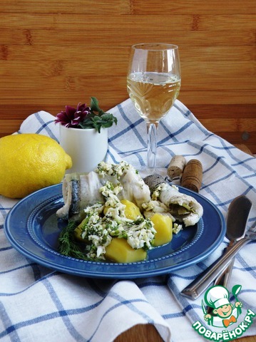 Подавать рыбу горячей, с отварным картофелем, политую масляным соусом. Бокал белого вина создаст хорошее настроение!