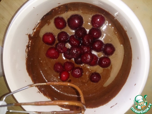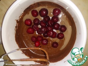 Далее, добавляем вишню без косточек. Я использовала замороженную. Всё перемешиваем.