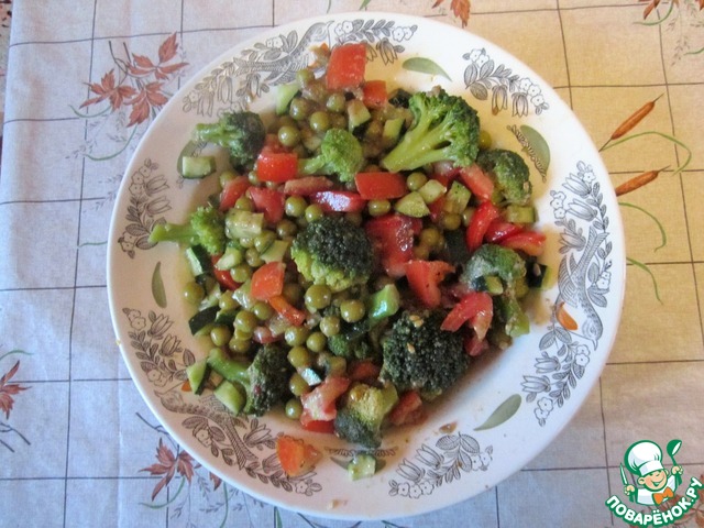 Всыпать горошек без жидкости, чеснок пропустить через пресс. Добавить брокколи.