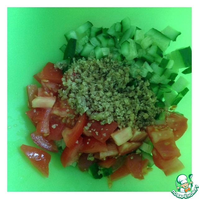 Огурец и помидор нарезать кубиками. Орехи измельчить в мясорубке или блендере. Вскипятить воду, забросить в нее соцветия брокколи. Варить пару минут, откинуть капусту на дуршлаг и обдать холодной водой.