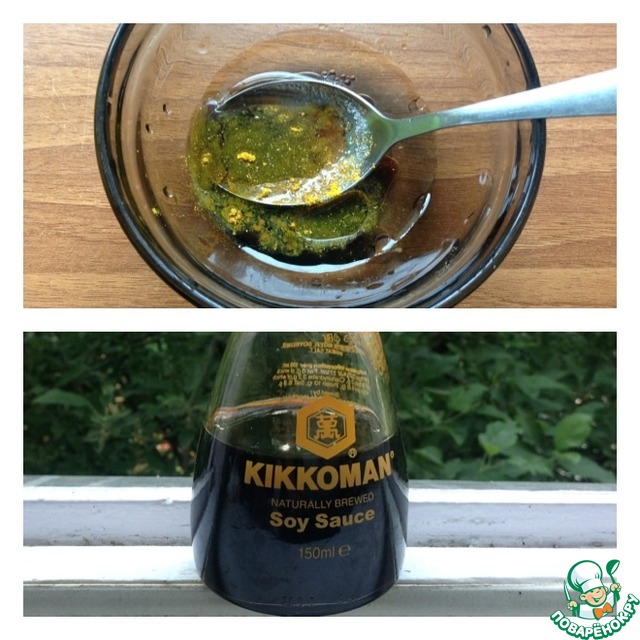 Для заправки смешать: соевый соус, бальзамический уксус, масло, соль, сахар, молотый перец и карри. Заправить салат и перемешать.