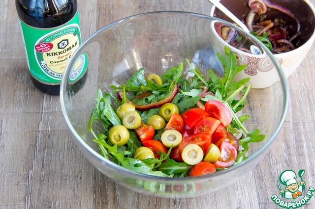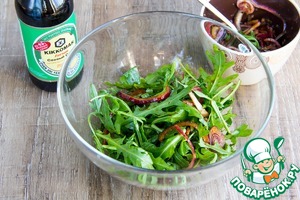 Рукколу смешать с маринованным луком и соусом из под него. Количество лука смотрите на свой вкус.