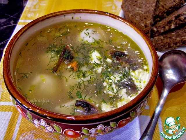 Обжарить это все немного и положить в одну из половинок нашего бульона и немного проварить.