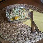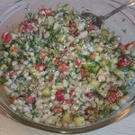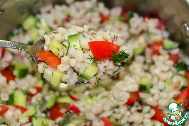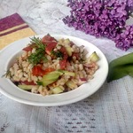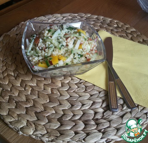 Салат по мотивам всем известного салата Табуле. Крупа и овощи - превосходное сочетание. Свежо и витаминно, сытно, но не тяжело, ярко и полезно, постно, просто и вкусно. В жаркий летний день - чудесный самодостаточный ужин. Очень удобный вариант для "ссобойки". Крупа может быть любая: рис, гречка, пшено. Заходите в гости.