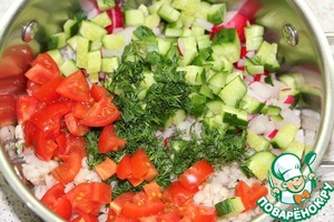 Укроп измельчить. В большую емкость положить овощи и перловую крупу (заранее сваренную, остывшую)