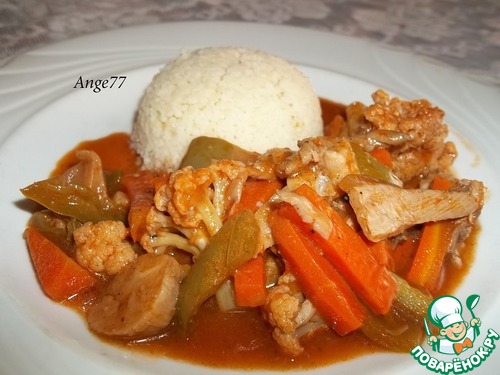 Влить воду и кокосовое молоко, 1ст. л. соевого соуса и сдобрить специями (по 1/2 ч. л. смеси перцев, зиры и кориандра, соль по вкусу). Тушить под крышкой, не забывая иногда перемешивать, до готовности всех овощей и грибов (минут 15). Подавать рагу горячим с рисом, гречкой, другими крупами или картофелем. Я подавала с кус-кусом.