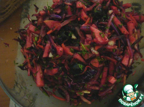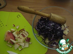 Оба вида капусты шинкуем тонко, присыпаем солью и мялкой бьём её, чтобы она дала сок. Яблоко режем соломкой. Отправляем в салатник.