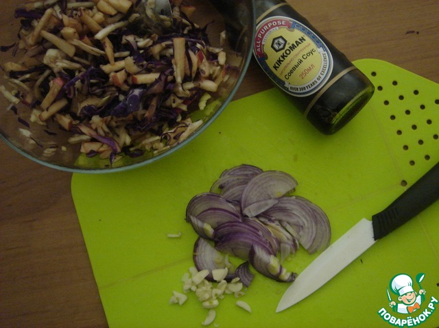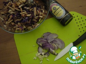 Чеснок мелко рубим, лук режем тонкими полу-кольцами. Всё отправляем в салатник.