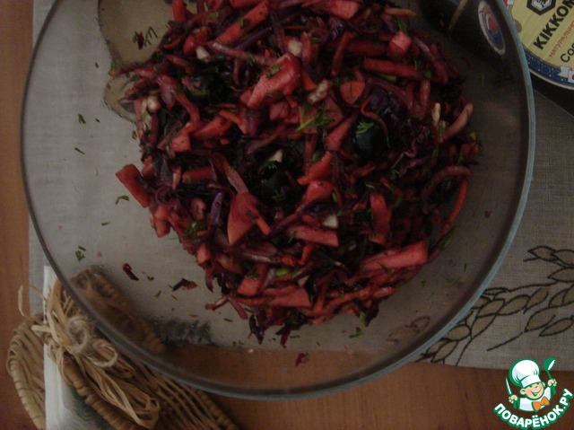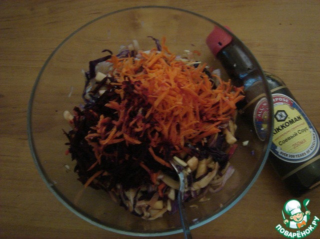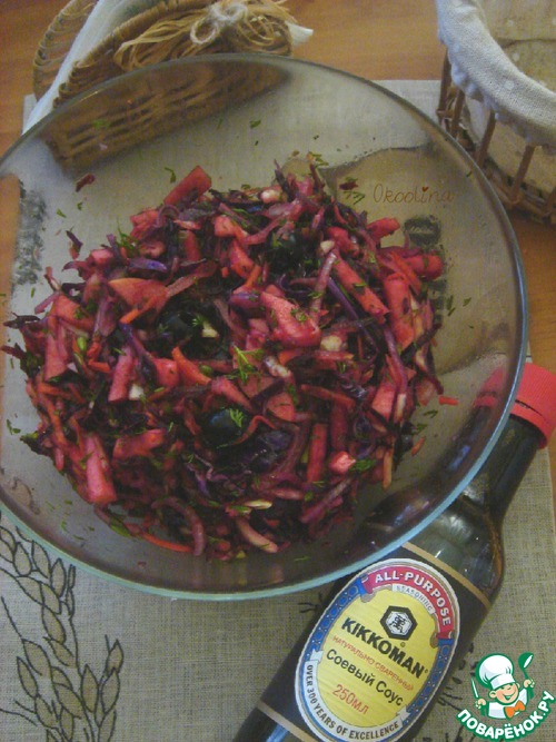 Овощной салат из двух видов капусты, свёклы, моркови, яблока, заправленный пикантной заправкой с соевым соусом. Легко, вкусно, полезно, витаминно!