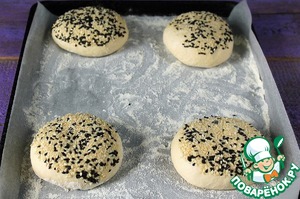 • Тесто согрелось, начнем его делить. Я делила тесто на 8 частей, вес каждой части ~ 108 гр. Каждый шарик округляем, подкатываем. В миску насыпаем кунжут. Берем один шарик, кисточкой смазываем его водой, кладем шарик в миску (мокрой стороной) и немного "расплющим", что бы получилась толстая лепешка. Выкладываем заготовку на противень. Даем заготовкам подойти ~ 30-40 минут. Выпекаем в предварительно разогретой до 180 гр духовке, первые 8 минут с паром, а потом до зарумянивания. Готовые булочки остужаем на решетке. Что бы булочки оставались мягкие, после того как они остынут, хранить их надо в целлофановом пакете.