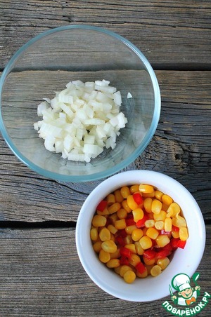Лук обжариваем на сковороде до румяности. Добавляем его к измельченной гречке, туда же добавляем кукурузу, болгарский перец и зелень. Все перемешиваем, при необходимости еще солим, перчим.