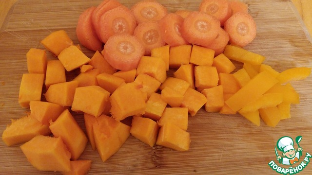 Тыкву, морковь и болгарский перец порезать на средние кусочки. Овощи залить небольшим количеством воды /только, что бы покрывала/ и отварить.