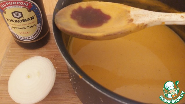 Довести до вкуса, приправив суп соевым соусом от ТМ "Киккоман" и смесью карри, орегано, паприки, сушенной мяты и перца.