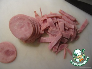 - Ветчина (в натуральной оболочке, плотной консистенции) — 300 г