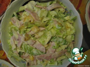 Листья салата отделяем от кочана, тщательно промываем, рубим с шириной шага 1 см.