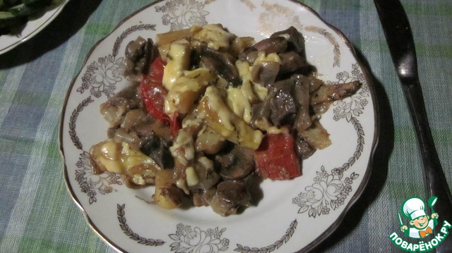 Добавляем грибы с луком вместе со всей жидкостью от жарки. Помидоры разрезаем на 4 части. Ложкой тщательно все перемешиваем и отправляем в пакет для запекания. Делаем парочку проколов на пакете, выкладываем пакет в форму для запекания, и отправляем в духовку на 25 минут при 190 град.