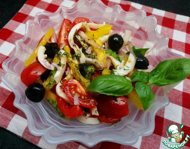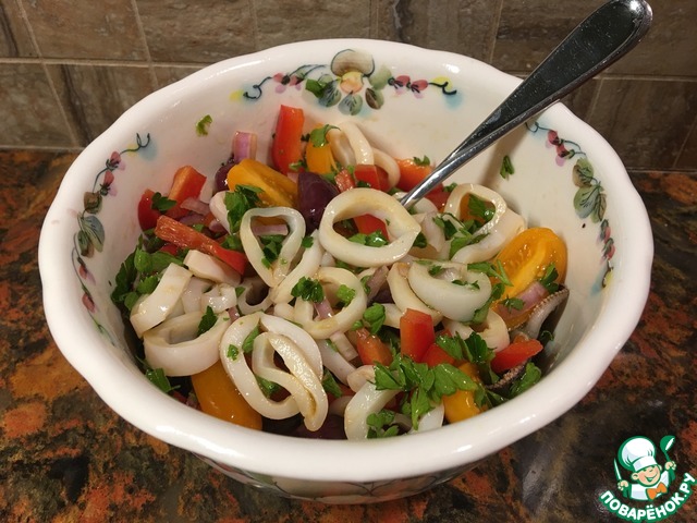 Смешаем кальмары с луком, помидорами черри, болгарским перцем, добавим нарезанную зелень.