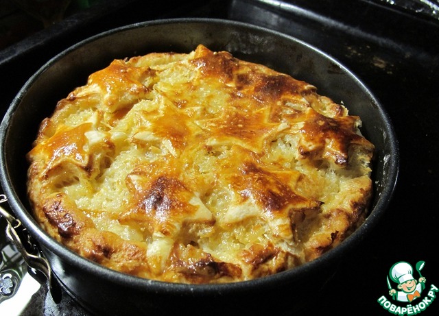 Затем выложить начинку. Из остатков теста, с помощью формочек для печенья сделать украшения для верха. Верх смазать желтком.