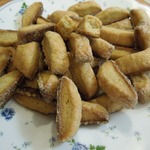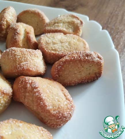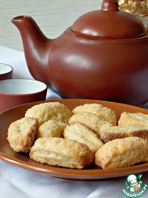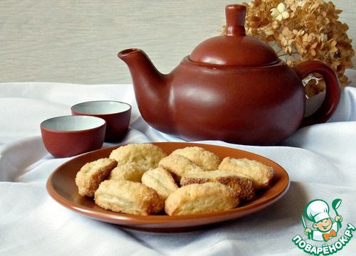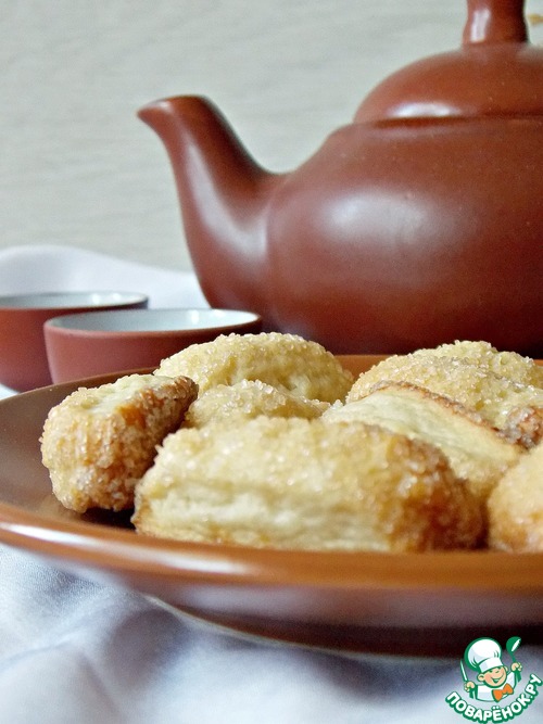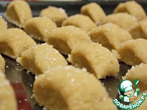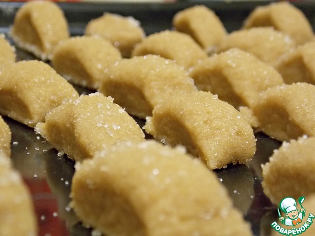 Разделить на несколько частей и раскатать в длину (колбаски ). Обвалять хорошенько в сахаре. Затем порезать колбаски на кусочки. Положить на противень.