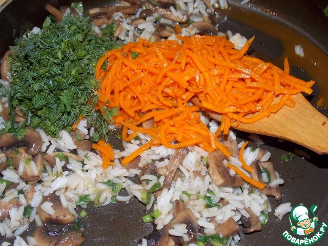 Добавить измельчённую морковь по-корейски, отварной рис, соевый соус, зелень, соль и перец. Прогреть и минуту.