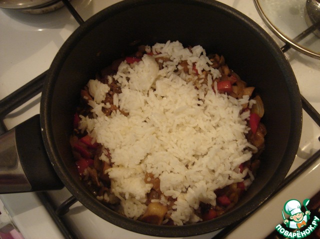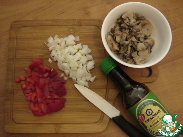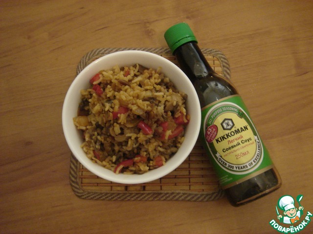 В разогретое масло в сотейнике я выложила лук. Позолотила его и положила перец. Немного обжарила почти до готовности. Шумовкой вынула грибы и отправила в сотейник. Сделала до полного выпаривания жидкости из грибов, налила соевый соус, перемешала и добавила отварной рис. Опять всё соединила. Попробовать можно на соль, я не солила, мне соли хватило.
