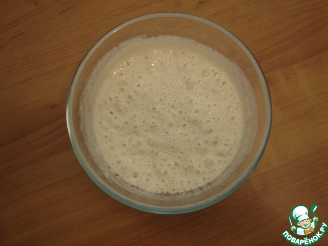 Делаем опару. Наливаем 2 ст л тёплой воды в посуду глубокую. Добавляем в неё дрожжи и сахар 1/2 ст л. Перемешиваем, добавляя муку 2 ст л. Ставим в тёплое место на 15 минут. Опара готова.