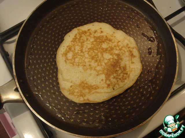 Печём блины. Разогреваем сковороду и подмазываем её подсолнечным маслом (1 ст л осталась). Поварёшкой наливаем тесто. Блины пекла D~15 см. Блины толстые. Жарим до красивого цвета с одной стороны.