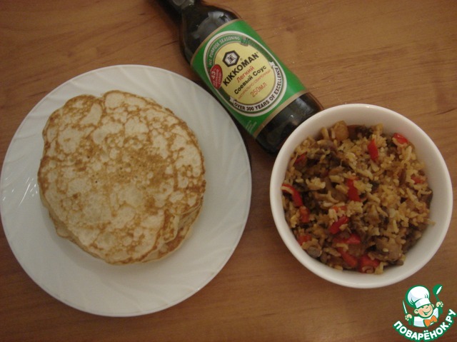 Постные блины на воде, дрожжевые, толстые. Начинка из вешенок+лук+болгарский перец+ рис с соевым соусом KIKKOMAN лёгкий. Сытная и вкусная еда. Разнообразим меню в Пост!