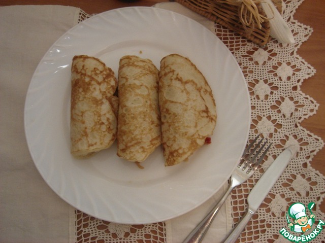 На одну порцию по 3 блина. Берём тарелку и на половину блина выкладываем начинку, второй половиной покрываем её.