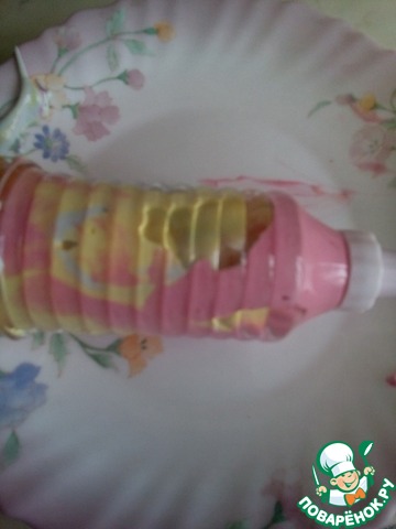 Берем кондитерский мешок или шприц и по очереди наполняем его цветными белками