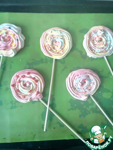 Размер меренги регулируете сами. Шпажкой протыкаем меренгу до середины и посыпаем кондитерской посыпкой.