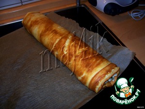 Нежный закусочный рулет из заварного теста, свежесть и необычность которому придает лeгкий рыбный салат. Отличный вариант как для завтрака, так и для праздничного стола.