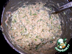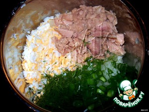 Теперь добавить размятого вилкой тунца, мелко нарезанный зелёный лук и укроп.