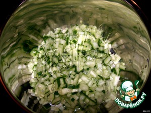 В мисочку всыпать нарезанный мелкими кубиками огурец. -