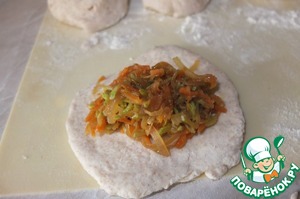• Раскатываем лепешку, кладем 1 столовую ложку начинки, формируем булочку.