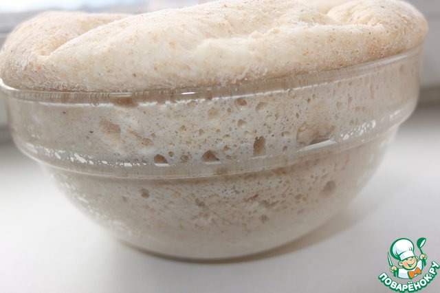• Добавляем просеянную цельнозерновую муку и 100 г пшеничной (оставшуюся муку оставляем на подпыл) Замешиваем тесто, которое не липнет к рукам.