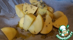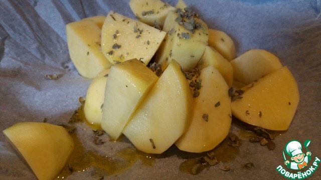 Духовку разогреть до 180'. Картофель почистить, порезать крупно, полить оливковым маслом и посыпать орегано. Картофель завернуть в пергамент и запекать в духовке 30-45 мин до мягкости (в зависимости от картофеля).