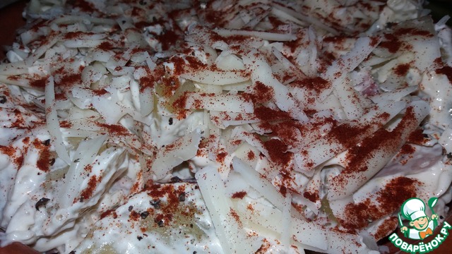 • Выложить в форму для запекания, сверху посыпать оставшимся сыром и копченой паприкой. Запекать до золотистой корочки при 180'.