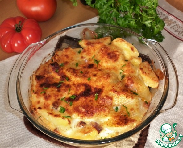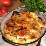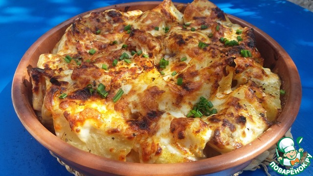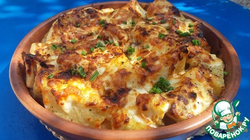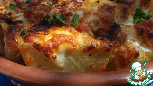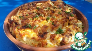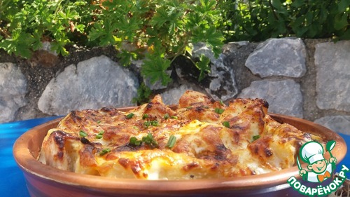 Выложить в форму для запекания, сверху посыпать оставшимся сыром и копченой паприкой. Запекать до золотистой корочки при 180'.
