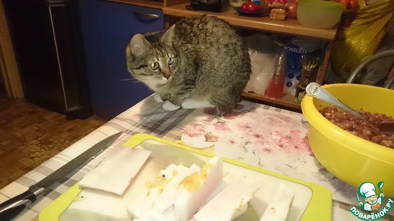 Достаем сало и режем его на кубики не больше 0,5 см. (Могут появиться попрошайки.:)) Сало подморозили, чтобы было удобнее резать.