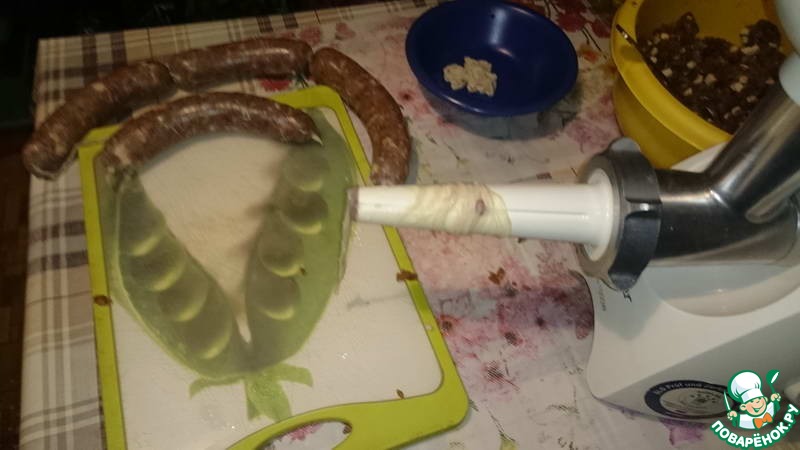 Пока вымачивается черева (минут 20), берем часть фарша и начинаем прокручивать, пока он не начнет выходить из конца насадки. Делаем это для того, чтобы в оболочку не попал воздух.