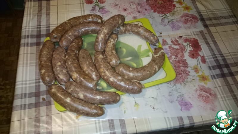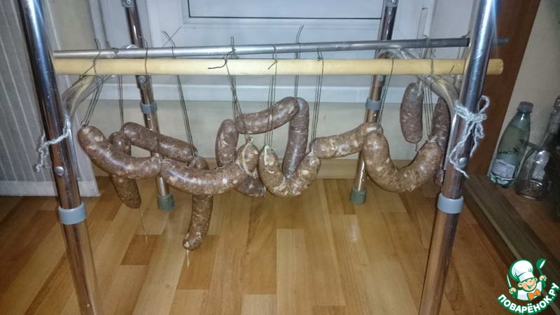 Подвешиваем домашнюю колбаску и сушим 10-15 дней.