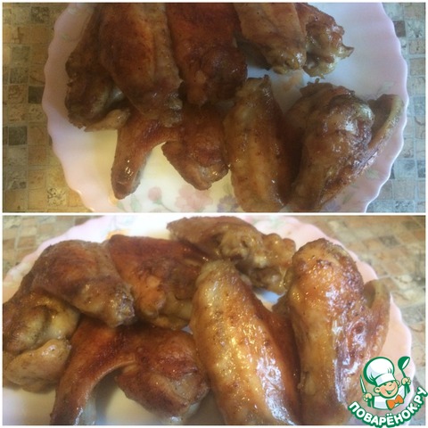 Крылышки покрываются аппетитной румяной корочкой. На дне остается немного жидкости, до сухости готовить не надо. -