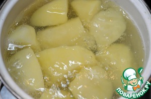Картофель почистите и отварите в подсоленной воде 30 минут после закипания. Затем картофельный отвар слейте, но пока не выливайте.