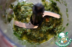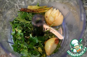 В чашу блендера положите нарезанную зелень и зелёный лук, выдавите мякоть запечённого чеснока и запеченный лук, добавьте оливковое масло.