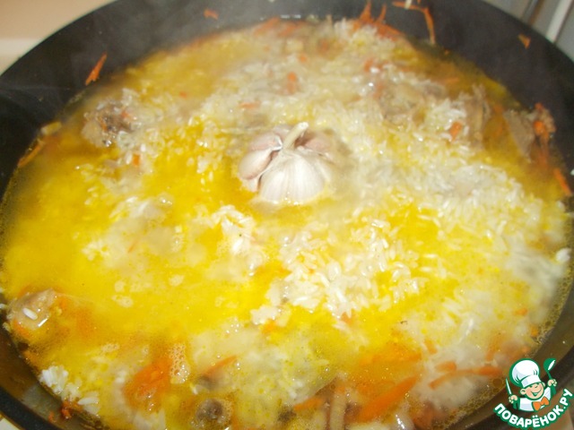Далее добавляю лук с морковью к мясу, слегка обжариваю на среднем огне. Всыпаю промытый рис, в середину ставлю головку чеснока и заливаю соленой водой. Приправы ни какие не добавляю, без них нежнее плов получается. Накрываю сковороду крышкой и готовлю на медленном огне в течении 30 минут, ну или пока вода вся впитается в рис.