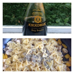 [+5]Единственное, что у меня спагетти были уже отдельно отварены, поэтому использовала все остальное, как "соус" сверху. Соевого соуса было немного, поэтому дополнила соусом терияки