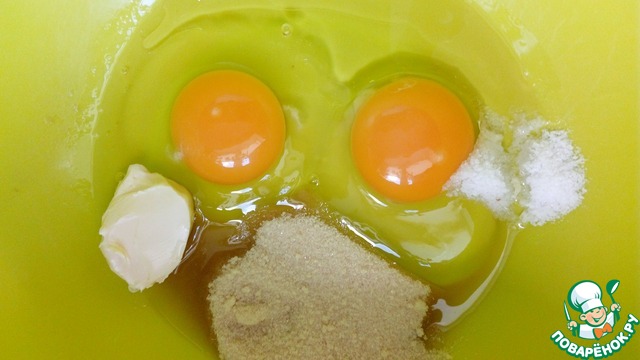 Для теста нужно просто смешать все ингредиенты. Сначала яйца растереть с маслом сливочным и растительным, сахаром, солью. Потом добавить муку.