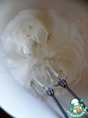 Отделить белки от желтков. Взбить белки со щепоткой соли в мягкую пену, затем, подсыпая ложку сахара, взбить до жестких пиков. |